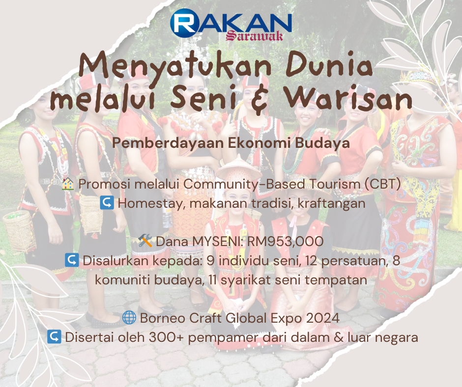 Inisiatif ini turut diperkukuh melalui penganjuran Borneo Craft Global Expo 2024 yang menghimpunkan lebih 300 pameran dari dalam dan luar negara, bertujuan melatih dan membuka pasaran antarabangsa kepada komuniti budaya tempatan, sekali gus mengangkat budaya Sarawak sebagai aset ekonomi dan pendidikan yang berdaya saing di peringkat global.