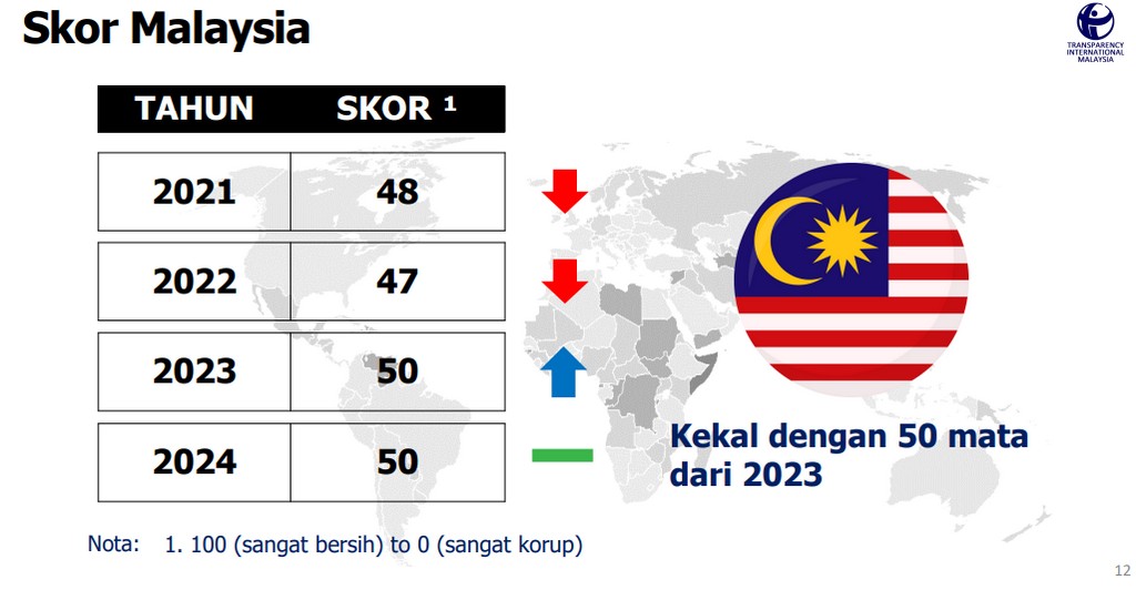 Indeks Persepsi Rasuah 2024 yang diterbitkan oleh Transparency International merekodkan skor Malaysia pada 50 daripada 100 dan berada di kedudukan ke-57 dunia, satu kedudukan yang kekal tanpa perubahan ketara sejak beberapa tahun kebelakangan ini.