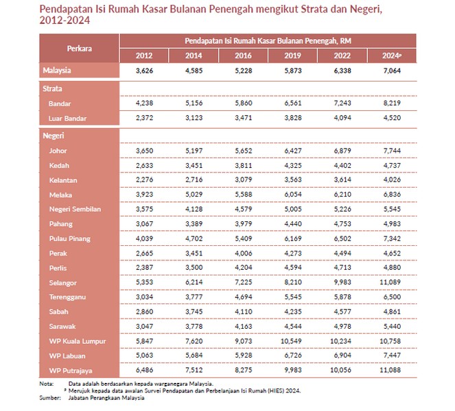 Data RMKe-13 menunjukkan pendapatan isi rumah penengah di Sarawak pada tahun 2024 hanyalah RM5,440, jauh lebih rendah berbanding Selangor (RM11,089) dan Kuala Lumpur (RM10,758).