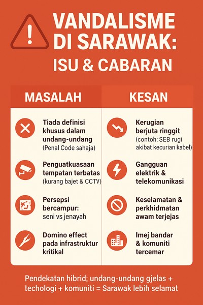 Namun, dengan langkah reformasi undang-undang, teknologi pengawasan, kerjasama pelbagai pihak, program seni komuniti, serta pendekatan restoratif, Sarawak berpeluang bukan sahaja menurunkan kadar vandalisme tetapi juga melahirkan masyarakat yang lebih bertanggungjawab, kreatif, dan prihatin terhadap harta awam.